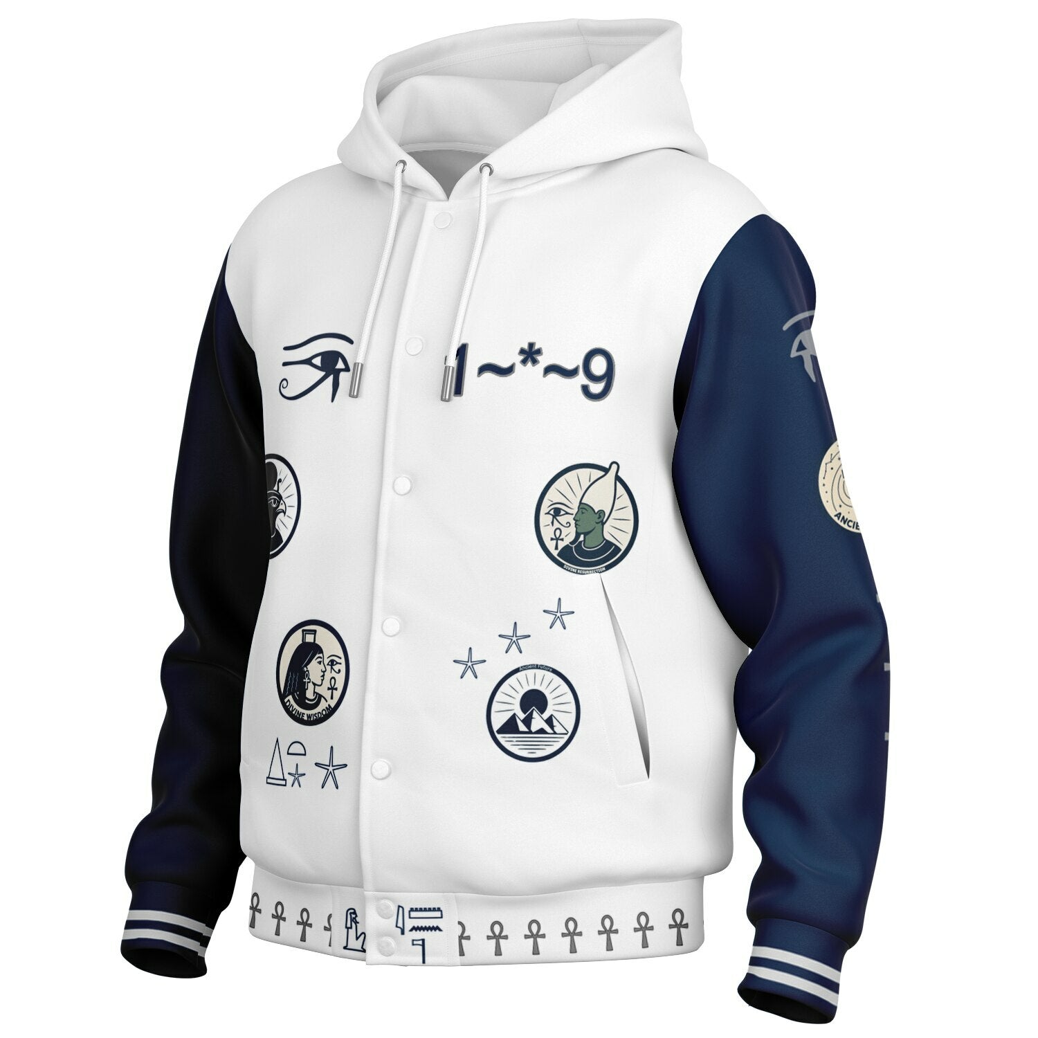 The HRU ELEVATION Varsity Hoodie merges ancient Kemetic symbolism with futuristic street style — a cloak for the chosen, for the ones walking the path between worlds.
